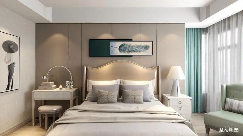 ▲次卧空间主要是以浅色为底调,大面积的莫兰迪色与浅色相平衡。极强线性装饰画带来的延伸感让视觉焕然一新。少许的金属元素摄入,瞬间提升了空间的精致度,将温润雅致与时尚轻奢糅合在同一空间里,每一处都洋溢着浪漫的气息。