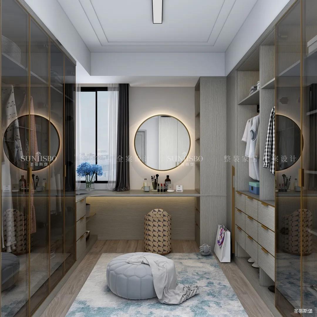 进入玄关区域就能感受到房主对时尚风格的偏爱,实木元素与简奢金属的碰撞,既有对材质的甄选,又有现代简奢的品质感。穿衣镜、换鞋凳、收纳柜等藏漏有序的分区,将屋主的生活归纳的井井有条。