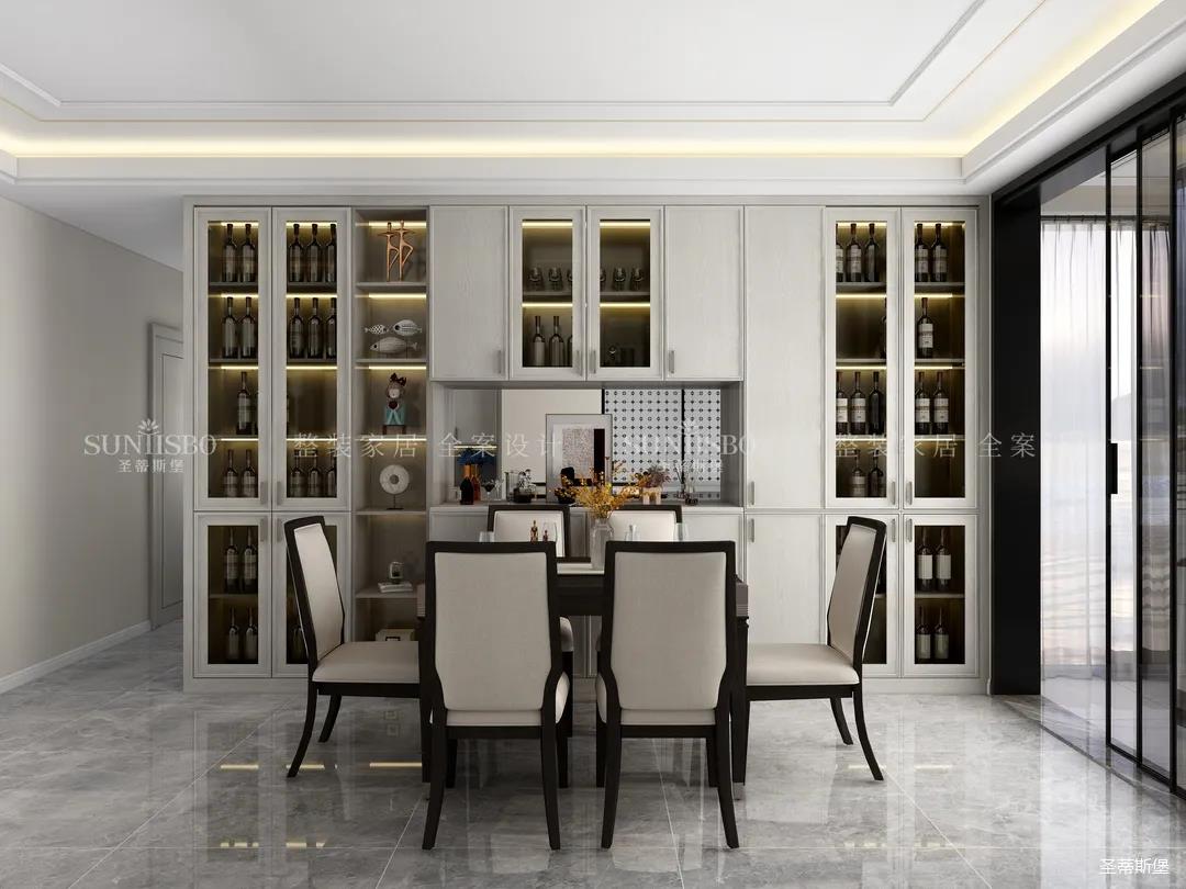 餐厅和客厅以大横厅的形式展开,设计师将实木、玻璃、皮质、金属等看似相互排斥的元素相互重组,让餐厅呈现多元式的轻奢氛围。深浅色彩,对称型的定制柜,都让空间形成强有力的质感对比。无论是午餐窗外的车水马龙,还是晚宴的点点繁星,都能给屋主带来良好的就餐体验。